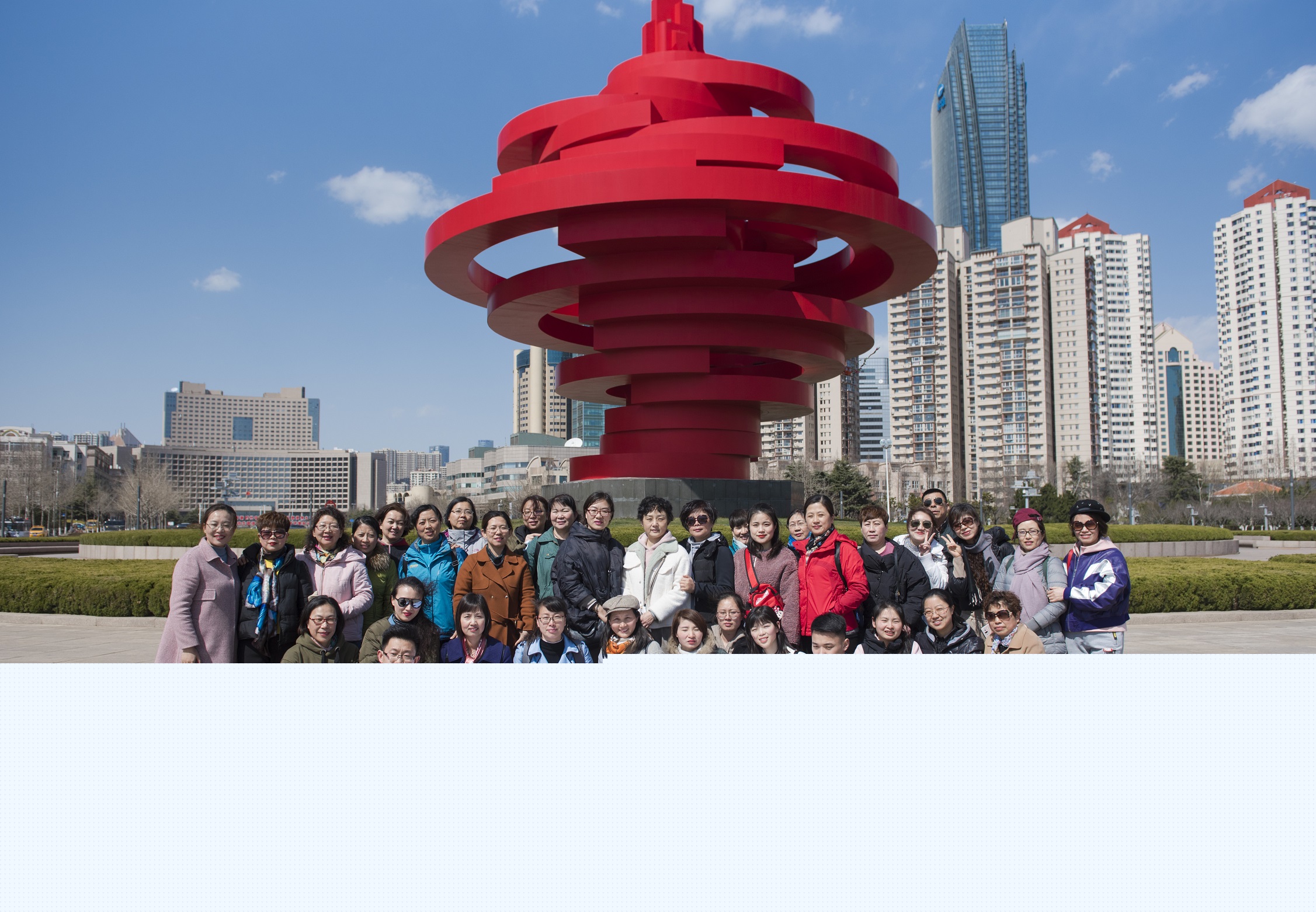 踏著晨曦,迎著朝陽,這個初春的早晨,我們一路向北出發(fā),在姐妹們一路的歡聲笑語中,我們來到了青島這個美麗的海濱城市。通過導(dǎo)游的一路講解和帶領(lǐng)下,我們先行游覽了青島的中山公園和五四廣場。初春的公園,萬物復(fù)蘇,一派生機(jī),隨風(fēng)飄舞的柳絲,草坪鉆露的新綠,湖邊怒放的迎春花,濃濃的春意盡現(xiàn)眼前。大家也一掃平日的疲憊,三五成群或兩兩相伴,行走在花間小道上,邊走邊聊,邊走邊看,在春日的暖陽里,盡享輕松愜意的閑適時光。在五四廣場,最先看到的便是那標(biāo)志性建筑“五月的風(fēng)”?;鸺t的顏色,螺旋上升的碩大造型,在藍(lán)天白云和茵茵綠草的映襯下,格外的耀眼醒目。一行人迎著海風(fēng)漫步前行,感受海天一色美景的同時,大家也紛紛駐足留影,定格美好瞬間。